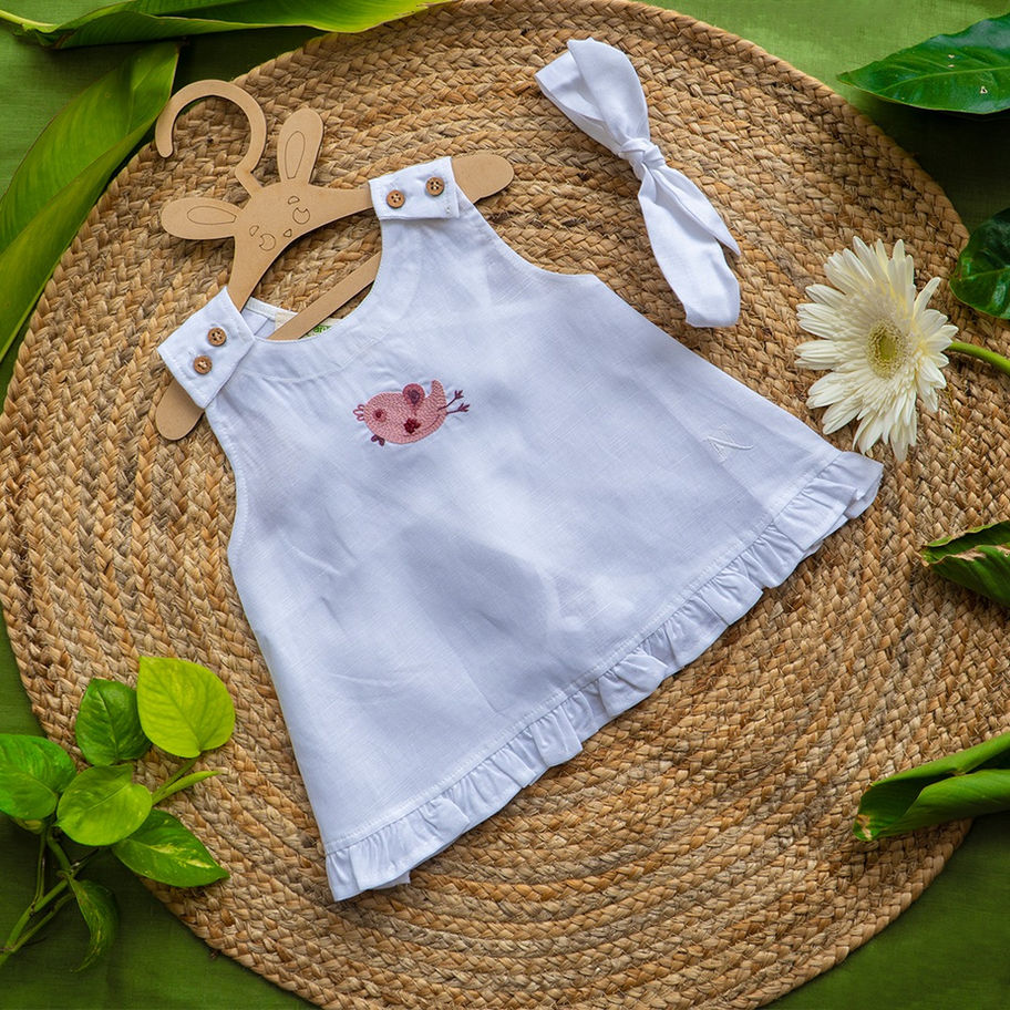 This adorable white top is a blend of simplicity and charm. Featuring a delicate pink bird motif, it adds just the right pop of color. Wooden buttons on the shoulder allow for easy adjustments, while gentle gathers at the hem enhance its playful vibe. The back design adds a stylish twist, making it as pretty from behind as it is from the front. Lightweight, breathable, and sustainable — it’s made for comfort with a whole lot of cuteness